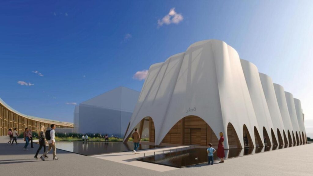 Lankytojai čia gali aplankyti kelias temines erdves. Jūrinę – kur lankytojai pradeda savo patirtį panirę į Kataro jūrų istoriją su eksponatais, kuriuose pristatomas šalies jūreivystės palikimas ir pakrančių pokyčiai. Žemės – kur pažintinė kelionė tęsiasi per dykumos kraštovaizdžius, kuriuose eksponuojami senoviniai Al Jassasiya uolų raižiniai ir interaktyvūs žemėlapiai, iliustruojantys Kataro raidą per pastaruosius 200 metų. Majlis ir biblioteką – kur yra erdvės, skirtos apmąstymams ir kultūriniams mainams. Plačiau apie Kataro paviljoną – skaityti čia.